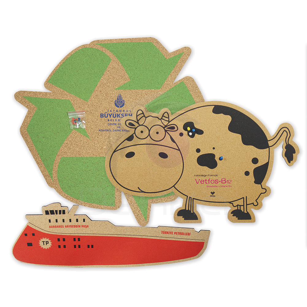 - 1 mm mantar - 3 mm eva - Tek renk serigrafi baskı - 4 adet mantar çivisi - 4 adet 3*3 cm çift taraflı bant
